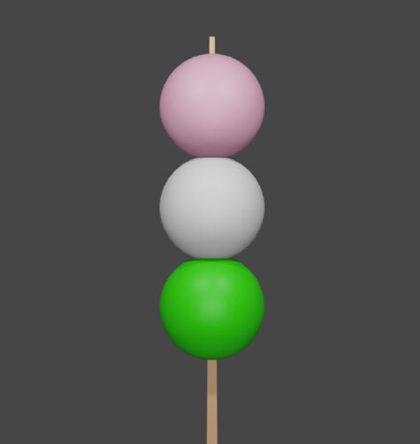 今回は子どもと一緒にお団子を作ってみますUV球のオブジェクトを使って団子をつくり、立方体を補足して櫛を作ってみますまた、マテリアルで色を付けて3色団子にしてみようと思います完成図はこんな感じ まずデフォルトの立方体とカメラ、ライトを消してそこ…